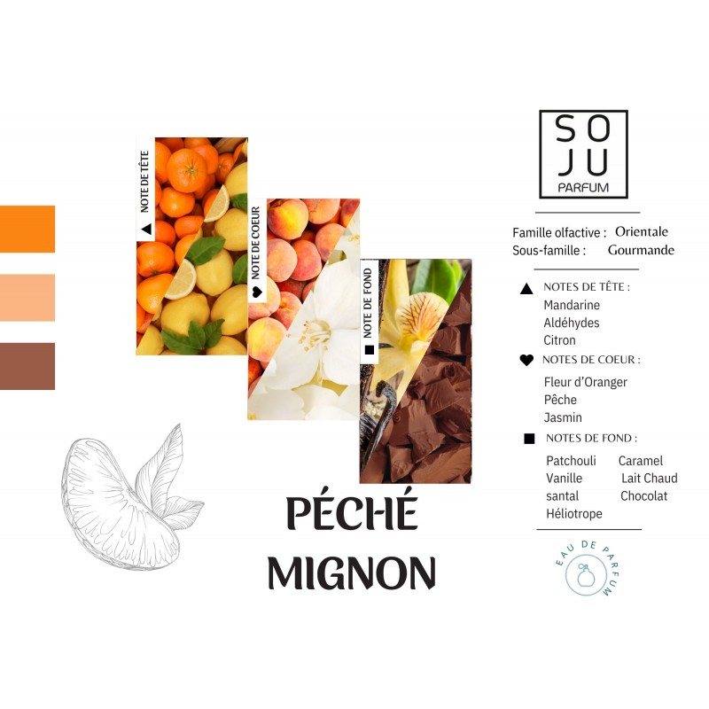 Le Caramel omniprésent dans cette fragrance se dévoile sous plusieurs facettes : pétillant en tête avec la Mandarine et le Citron, il devient plus léger en cœur avec la Fleur d’Oranger, la Pêche et le Jasmin pour, enfin, devenir gourmand avec la Vanille, le Chocolat et le Patchouli en notes de fond.