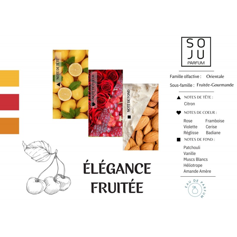 Elégance Fruitée est chic et terriblement glamour avec ses notes de Cerise, de Fruits Rouges, de Réglisse, d’Amande amère et de Patchouli.